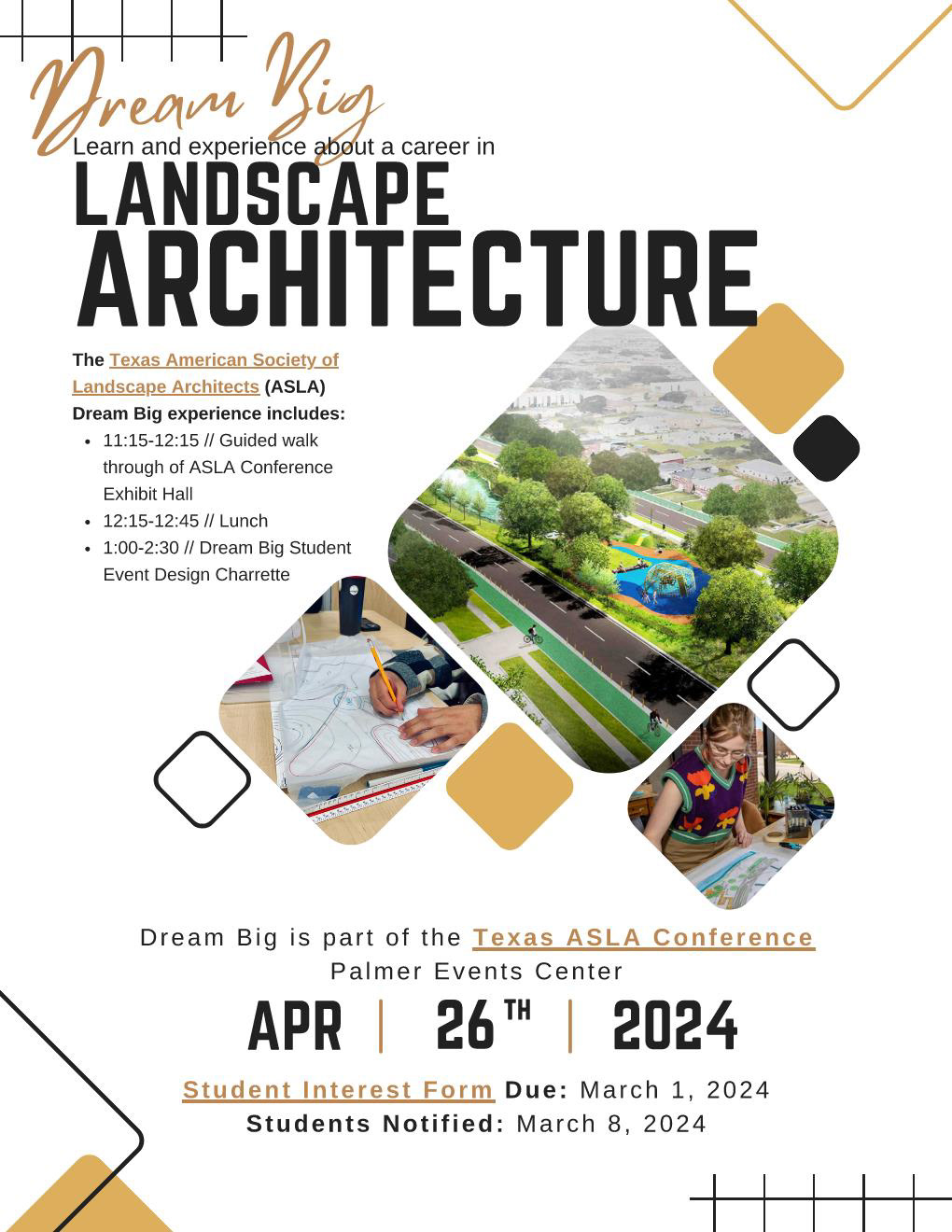 The DEI Committee hosted DREAM BIG at Texas ASLA in 2024, where students were invited to participate in a design charrette to learn about Landscape Architecture. The students were also able to experience a day at the conference and tour the expo hall.